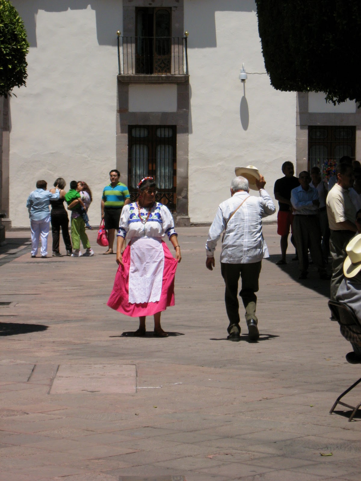 Sunday in the Plaza de Armas: Huapango musicians and dancers, come down from the mountains to entertain us. This appears to be the Mexican equivalent of West Virginia traditional music (think Augusta Heritage Festival) and the folk dancing associated with it. Different attire, though.